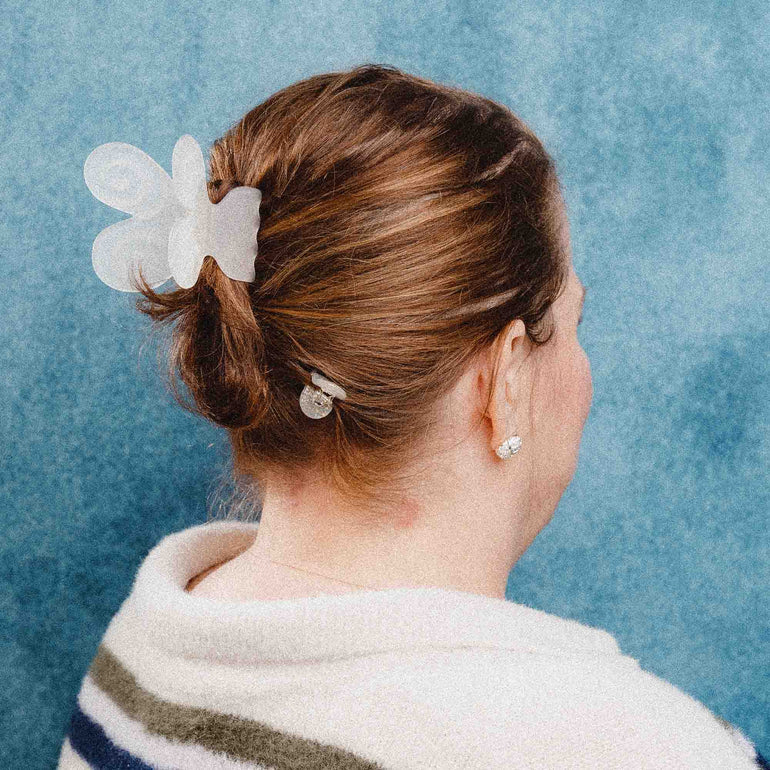 This medium sized hair claw features dreamy swirl butterfly wings and a soft matte finish. Provides a secure hold for thin to medium hair, perfect for quick French twists or effortless half-up styles for thicker hair.